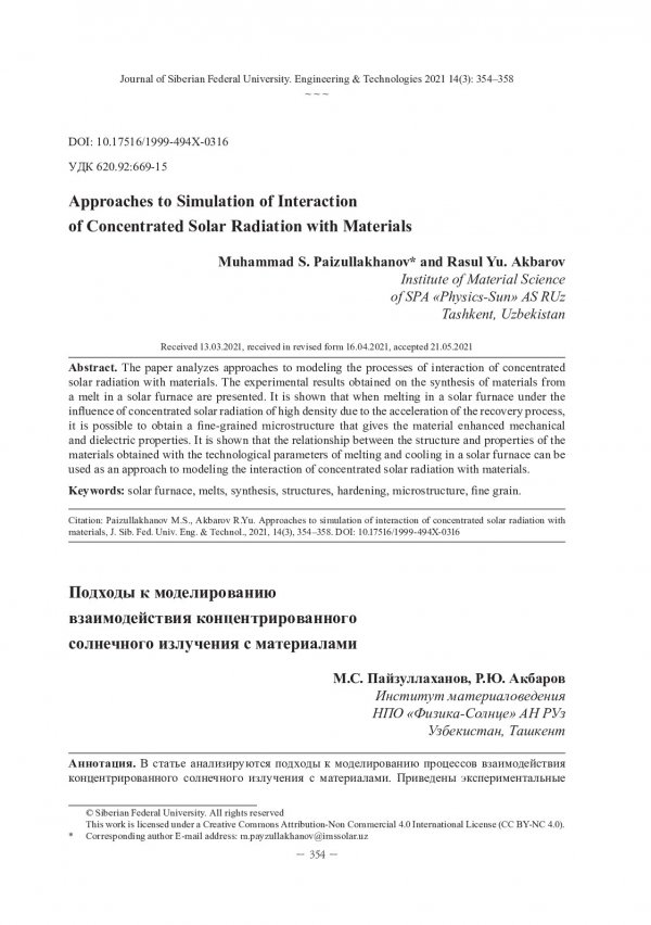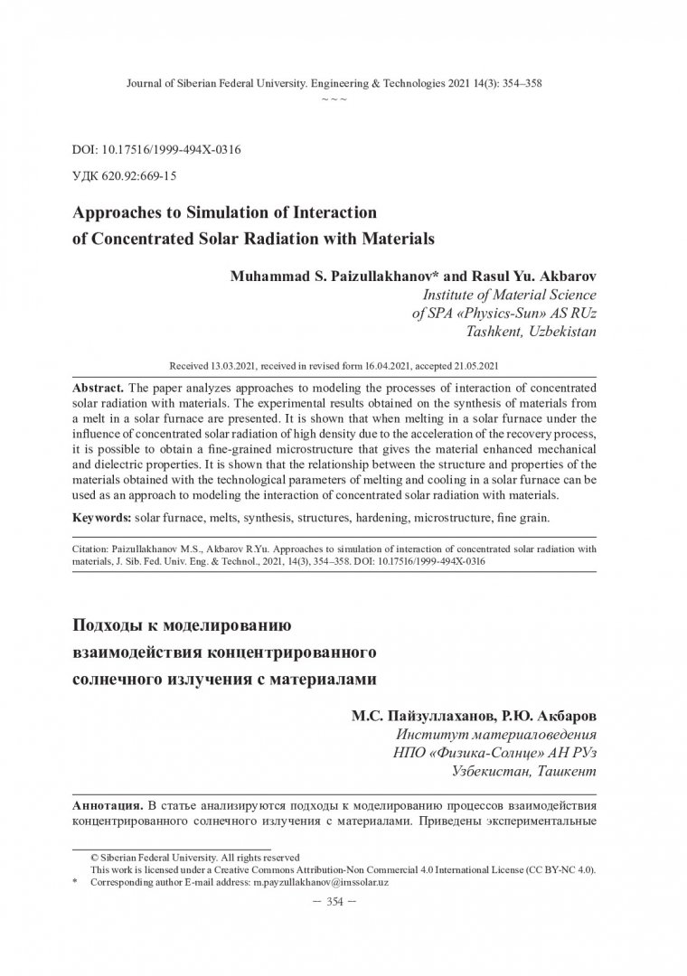 Библиографическое описание: Paizullakhanov, Muhammad S... Approaches to Simulation of Interaction of Concentrated Solar Radiation with Materials = Подходы к моделированию взаимодействия концентрированного солнечного излучения с материалами / M. S. Paizullakhanov, Rasul Yu. Akbarov. - Текст : непосредственный // Журнал Сибирского федерального университета. Техника и технологии. - 2021. - Т. 14, № 3. - С. 354-358. - Библиогр.: с. 358. - ISSN 1999-494X.