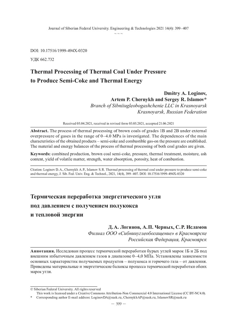 Библиографическое описание:Логинов, Д. А. Термическая переработка энергетического угля под давлением с получением полукокса и тепловой энергии / Д. А. Логинов, А. П. Черных, С. Р. Исламов. - Текст : непосредственный // Журнал Сибирского федерального университета. Техника и технологии. - 2021. - Т. 14, № 4. - С. 399-407. - Библиогр.: с. 406-407. - ISSN 1999-494X.