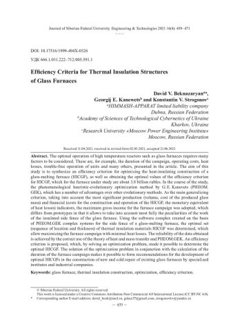 Библиографическое описание: Бекназарян, Д. В. Критерии эффективности теплоизоляционных конструкций стекловаренных печей / Д. В. Бекназарян, Г. Е. Каневец, К. В. Строгонов. - Текст : непосредственный // Журнал Сибирского федерального университета. Техника и технологии. - 2021. - Т. 14, № 4. - С. 459-471. - Библиогр.: с. 469-471. - ISSN 1999-494X.