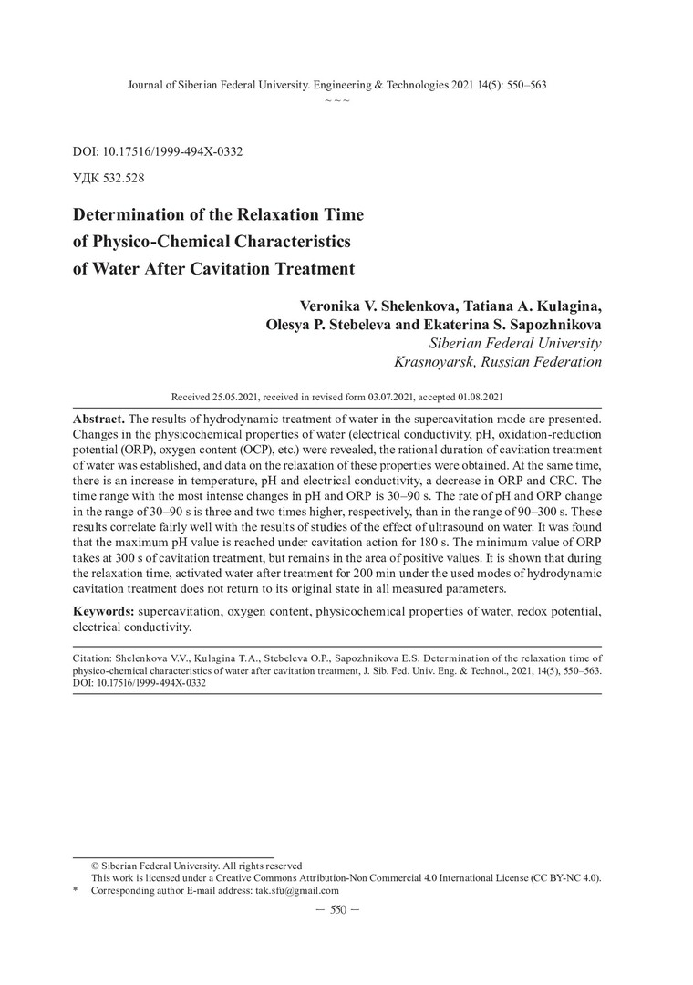 Библиографическое описание: Определение времени релаксации физико-химических характеристик воды после кавитационной обработки / В. В. Шеленкова, Т. А. Кулагина, О. П. Стебелева, Е. С. Сапожникова. - Текст : непосредственный // Журнал Сибирского федерального университета. Техника и технологии. - 2021. - Т. 14, № 5. - С. 550-563. - Библиогр.: с. 560-563. - ISSN 1999-494X.