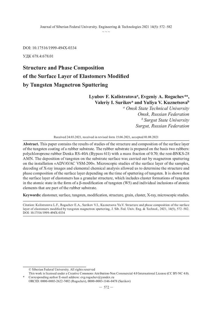 Библиографическое описание: Структура и фазовый состав поверхностного слоя эластомеров, модифицированных вольфрамом методом магнетронного распыления / Л. Ф. Калистратова, Е. А. Рогачев, В. И. Суриков, Ю. В. Кузнецова. - Текст : непосредственный // Журнал Сибирского федерального университета. Техника и технологии. - 2021. - Т. 14, № 5. - С. 572-582. - Библиогр.: с. 581-582. - ISSN 1999-494X.