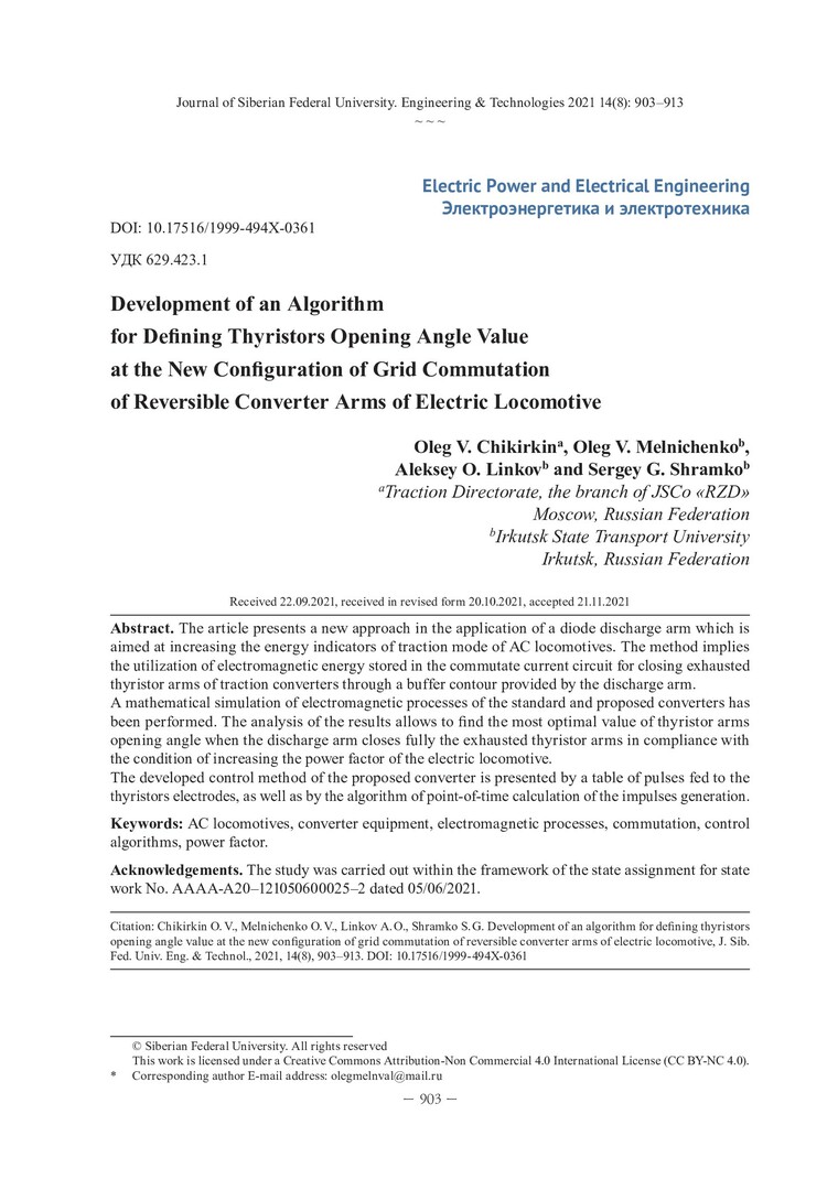 Библиографическое описание:Разработка алгоритма определения величины угла открытия тиристоров при новой организации сетевой коммутации плеч выпрямительно-инверторного преобразователя электровоза / О. В. Чикиркин, О. В. Мельниченко, А. О. Линьков, С. Г. Шрамко. - Текст : непосредственный // Журнал Сибирского федерального университета. Техника и технологии. - 2021. - Т. 14, № 8. - С. 903-913. - Библиогр.: с. 911-913. - ISSN 1999-494X.