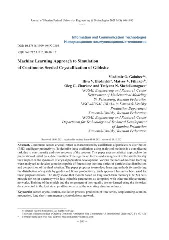 Библиографическое описание: Machine Learning Approach to Simulation of Continuous Seeded Crystallization of Gibbsite = Моделирование непрерывной затравочной кристаллизации гиббсита методом машинного обучения / V. O. Golubev, I. V. Blednykh, M. V. Filinkov [et al.]. - Текст : непосредственный // Журнал Сибирского федерального университета. Техника и технологии. - 2021. - Т. 14, № 8. - С. 966-985. - Библиогр.: с. 983-985. - ISSN 1999-494X.