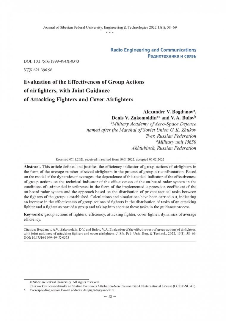 Библиографическое описание: Богданов, А. В. Оценка эффективности групповых действий истребителей при совместном наведении атакующих истребителей и истребителей прикрытия / А. В. Богданов, Д. В. Закомолдин, В. А. Булов. - Текст : непосредственный // Журнал Сибирского федерального университета. Техника и технологии. - 2022. - Т. 15, № 1. - С. 58-69. - Библиогр.: с. 68-69. - ISSN 1999-494X.