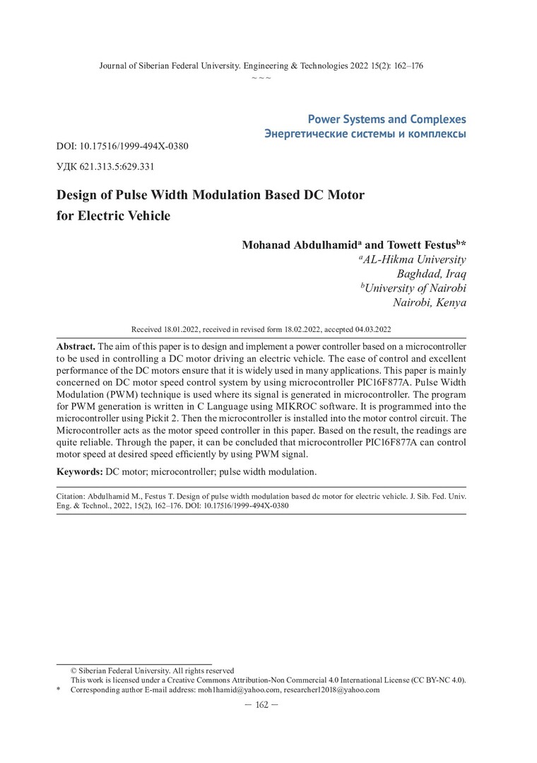 Библиографическое описание: Abdulhamid, Mohanad. Design of Pulse Width Modulation Based DC Motor for Electric Vehicle = Конструкция двигателя постоянного тока на основе широтно-импульсной модуляции для электромобиля / Mohanad Abdulhamid, Towett Festus. - Текст : непосредственный // Журнал Сибирского федерального университета. Техника и технологии. - 2022. - Т. 15, № 2. - С. 162-176. - Библиогр.: с. 176. - ISSN 1999-494X.