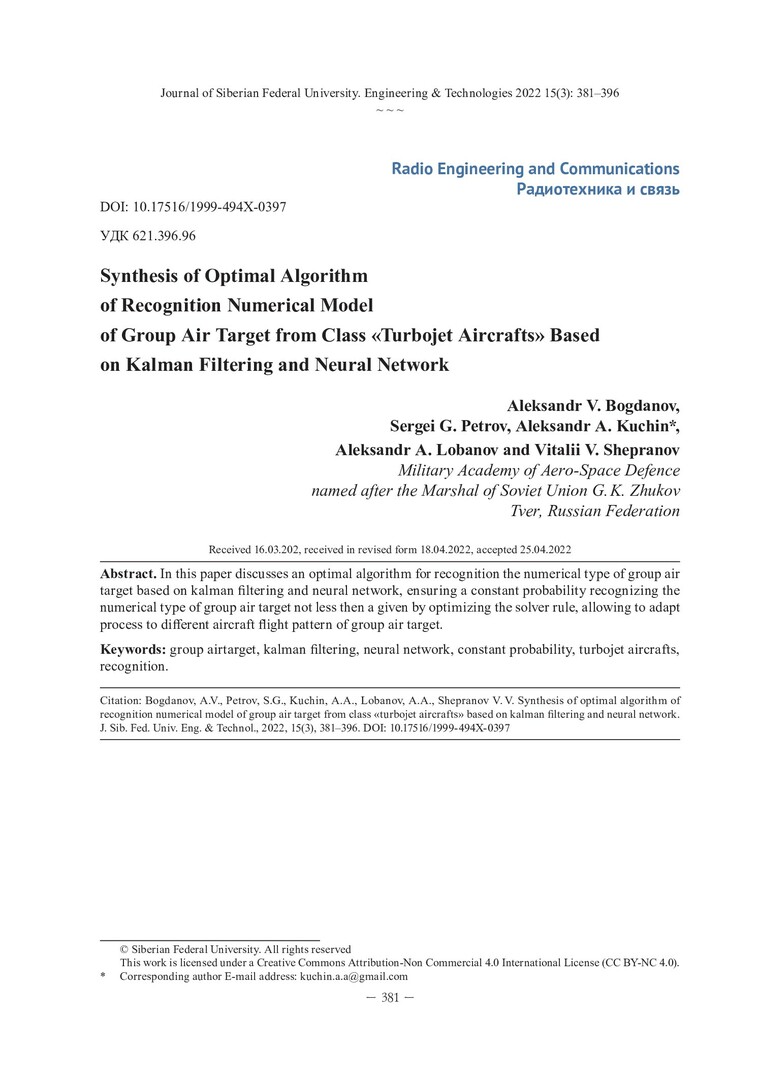 Библиографическое описание:Синтез оптимального алгоритма распознавания типового состава групповой воздушной цели из класса "самолеты с турбореактивными двигателями" на основе калмановской фильтрации и нейронной сети / А. В. Богданов, С. Г. Петров, А. А. Кучин [и др.]. - Текст : непосредственный // Журнал Сибирского федерального университета. Техника и технологии. - 2022. - Т. 15, № 3. - С. 381-396. - Библиогр.: с. 393-396. - ISSN 1999-494X.
