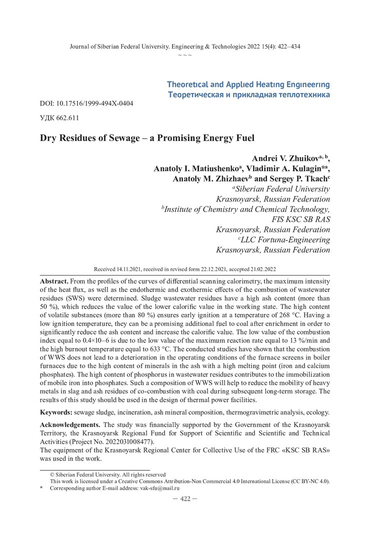 Библиографическое описание: Сухие остатки стоков – перспективное энергетическое топливо / А. В. Жуйков, А. И. Матюшенко, В. А. Кулагин [и др.]. - Текст : непосредственный // Журнал Сибирского федерального университета. Техника и технологии. - 2022. - Т. 15, № 4. - С. 422-434. - Библиогр.: с. 433-434. - ISSN 1999-494X.