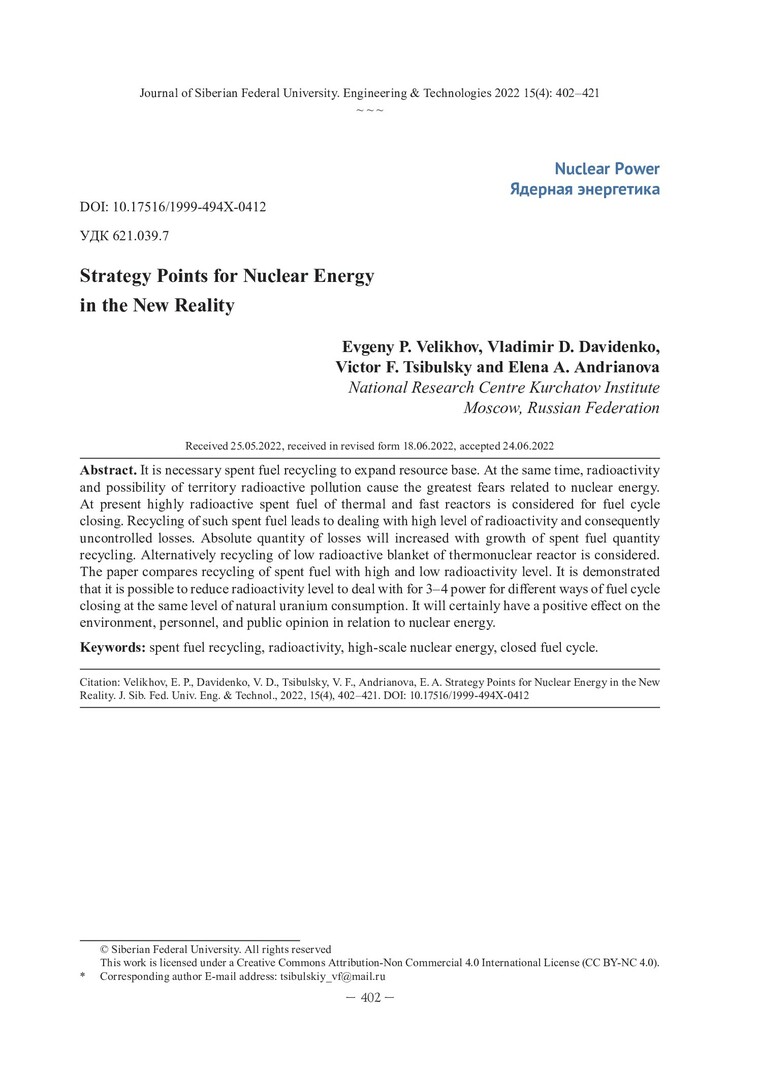Библиографическое описание: Стратегические ориентиры для ядерной энергетики в новой реальности / Е. П. Велихов, В. Д. Давиденко, В. Ф. Цибульский, Е. Ф. Андрианова. - Текст : непосредственный // Журнал Сибирского федерального университета. Техника и технологии. - 2022. - Т. 15, № 4. - С. 402-421. - Библиогр.: с. 420-421. - ISSN 1999-494X.