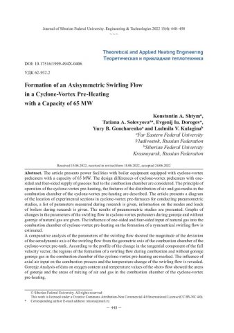 Библиографическое описание: Формирование осесимметричного закрученного потока в циклонно-вихревом предтопке мощностью 65 МВт / К. А. Штым, Т. А. Соловьёва, Е. Ю. Дорогов [и др.]. - Текст : непосредственный // Журнал Сибирского федерального университета. Техника и технологии. - 2022. - Т. 15, № 4. - С. 448-458. - Библиогр.: с. 458. - ISSN 1999-494X.