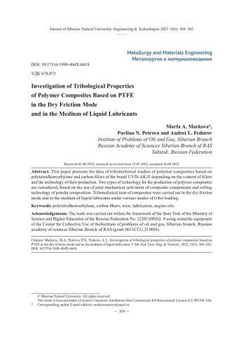 Библиографическое описание:Маркова, М. А. Исследование трибологических свойств полимерных композитов на основе ПТФЭ в режиме сухого трения и в среде жидких смазок / М. А. Маркова, П. Н. Петрова, А. Л. Федоров. - Текст : непосредственный // Журнал Сибирского федерального университета. Техника и технологии. - 2022. - Т. 15, № 5. - С. 569-582. - Библиогр.: с. 580-582. - ISSN 1999-494X.
