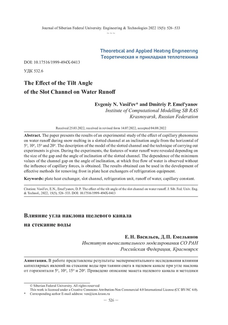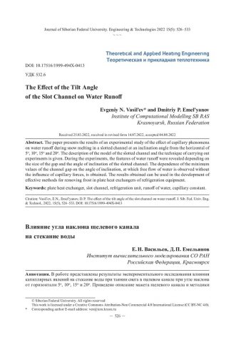 Библиографическое описание: Васильев, Е. Н. Влияние угла наклона щелевого канала на стекание воды / Е. Н. Васильев, Д. П. Емельянов. - Текст : непосредственный // Журнал Сибирского федерального университета. Техника и технологии. - 2022. - Т. 15, № 5. - С. 526-533. - Библиогр.: с. 532-533. - ISSN 1999-494X.