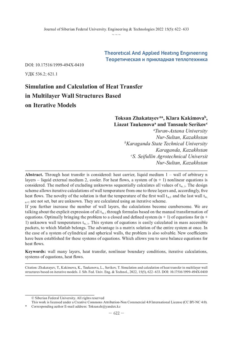 Библиографическое описание: Simulation and Calculation of Heat Transfer in Multilayer Wall Structures Based on Iterative Models = Моделирование и расчет теплопередачи в многослойных стеновых конструкциях на основе итерационных моделей / T. Zhakatayev, K. Kakimova, L. Taukenova, T. Serikov. - Текст : непосредственный // Журнал Сибирского федерального университета. Техника и технологии. - 2022. - Т. 15, № 5. - С. 622-633. - Библиогр.: с. 632-633. - ISSN 1999-494X.