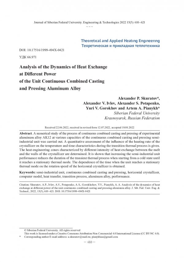 Библиографическое описание: Анализ динамики теплообмена при различной производительности установки непрерывного совмещенного литья и прессования алюминиевого сплава / А. П. Скуратов, А. В. Ивлев, А. С. Потапенко [и др.]. - Текст : непосредственный // Журнал Сибирского федерального университета. Техника и технологии. - 2022. - Т. 15, № 5. - С. 610-621. - Библиогр.: с. 619-621. - ISSN 1999-494X.
