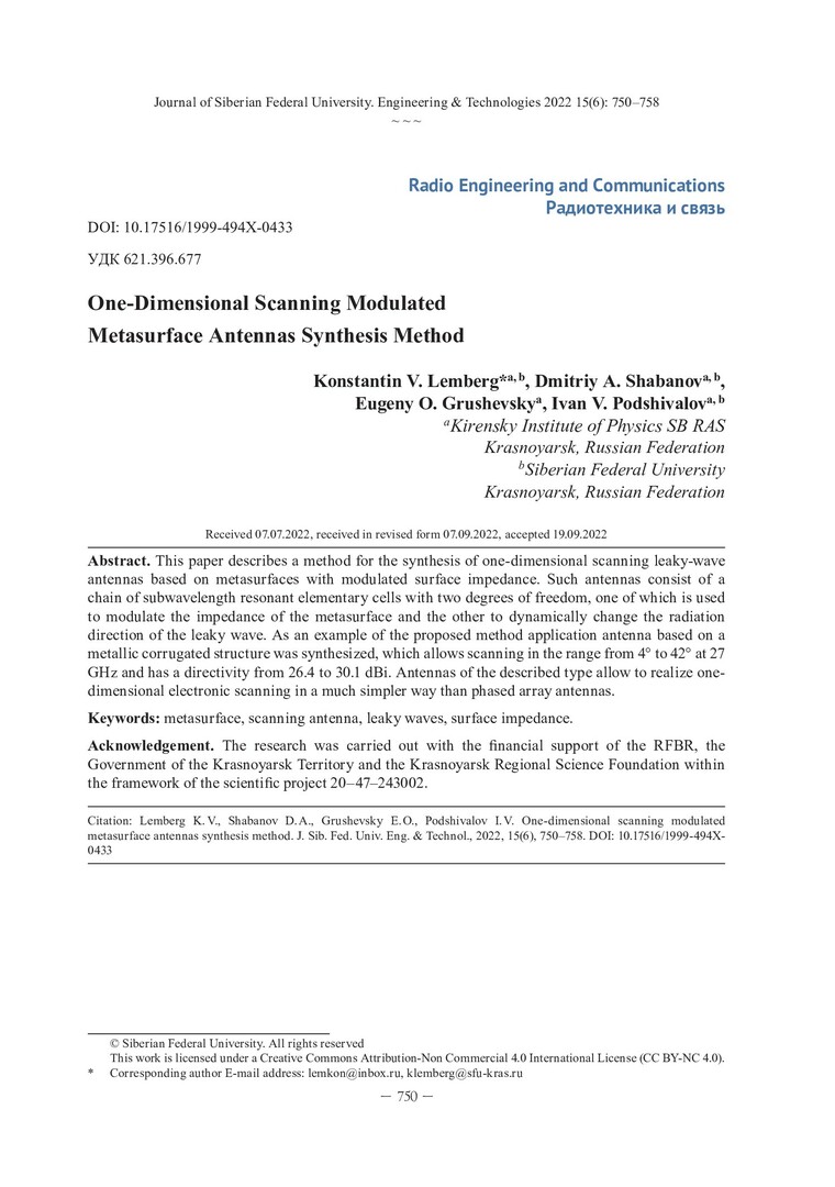 Библиографическое описание: Методика синтеза одномерно сканирующих антенн на основе модулированных метаповерхностей / К. В. Лемберг, Д. А. Шабанов, Е. О. Грушевский, И. В. Подшивалов. - Текст : непосредственный // Журнал Сибирского федерального университета. Техника и технологии. - 2022. - Т. 15, № 6. - С. 750-758. - Библиогр.: с. 757-758. - ISSN 1999-494X.