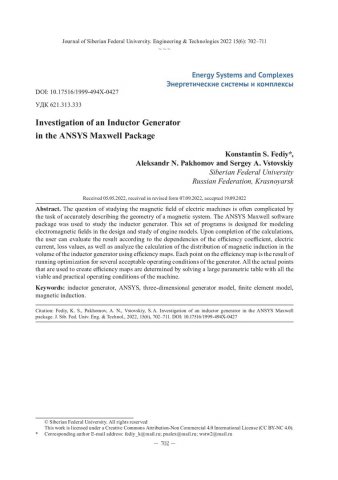 Библиографическое описание: Федий, К. С. Исследование индукторного генератора в пакете ANSYS Maxwell / К. С. Федий, А. Н. Пахомов, С. А. Встовский. - Текст : непосредственный // Журнал Сибирского федерального университета. Техника и технологии. - 2022. - Т. 15, № 6. - С. 702-711. - Библиогр.: с. 710-711. - ISSN 1999-494X.