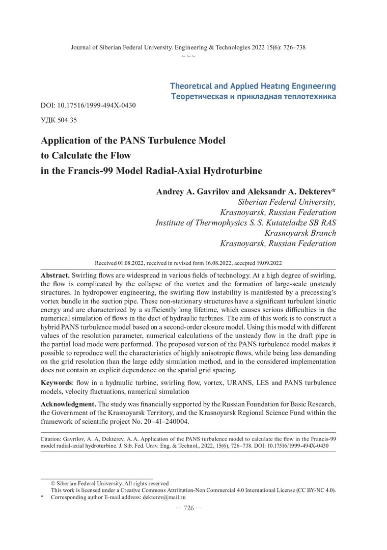 Библиографическое описание: Гаврилов, А. А. Применение PANS модели турбулентности для расчета течения в модельной радиально-осевой гидротурбине Francis-99 / А. А. Гаврилов, А. А. Дектерев. - Текст : непосредственный // Журнал Сибирского федерального университета. Техника и технологии. - 2022. - Т. 15, № 6. - С. 726-738. - Библиогр.: с. 737-738. - ISSN 1999-494X.