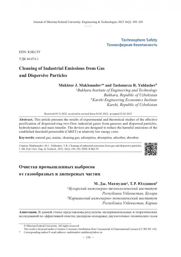 Библиографическое описание:Makhmudov, Mukhtor J... Cleaning of Industrial Emissions from Gas and Dispersive Particles = Очистка промышленных выбросов от газообразных и дисперсных частиц / M. J. Makhmudov, T. R. Yuldashev. - Текст : непосредственный // Журнал Сибирского федерального университета. Техника и технологии. - 2023. - Т. 16, № 2. - С. 198-210. - Библиогр.: с. 209-210. - ISSN 1999-494X.