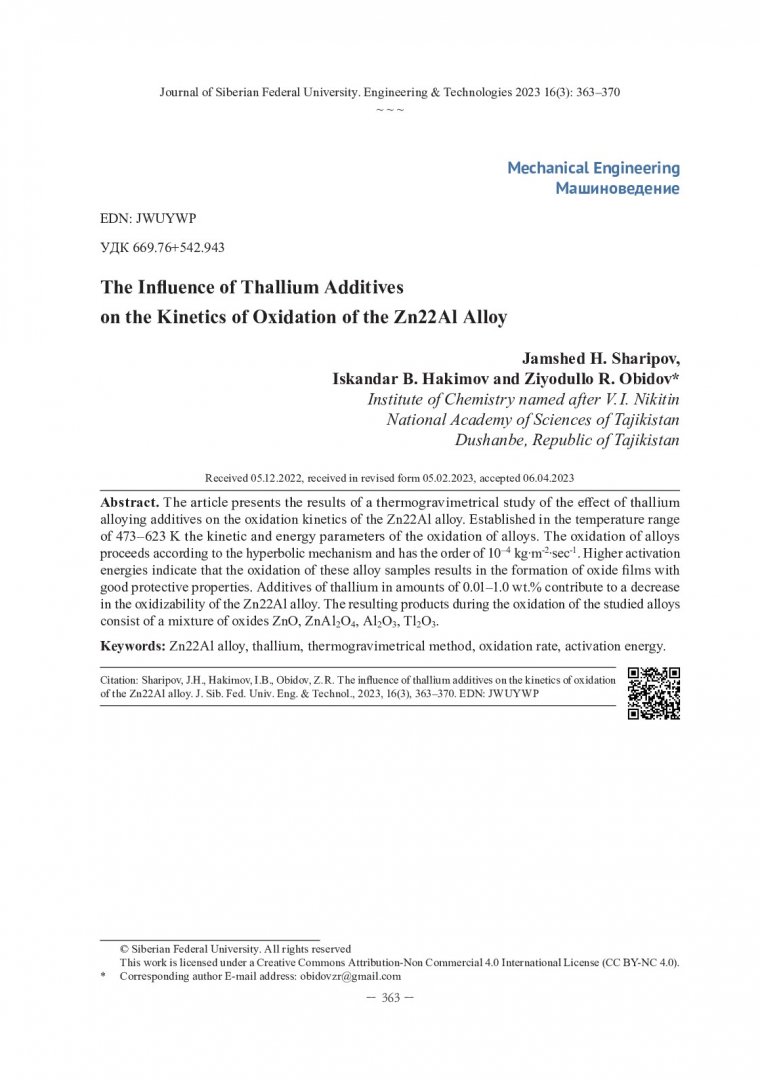 Библиографическое описание: Sharipov, J. H. The Influence of Thallium Additives on the Kinetics of Oxidation of the Zn22Al Alloy = Влияние добавок таллия на кинетику окисления сплава Zn22Al / J. H. Sharipov, I. B. Hakimov, Z. R. Obidov. - Текст : непосредственный // Журнал Сибирского федерального университета. Техника и технологии. - 2023. - Т. 16, № 3. - С. 363-370. - Библиогр.: с. 369-370. - ISSN 1999-494X.