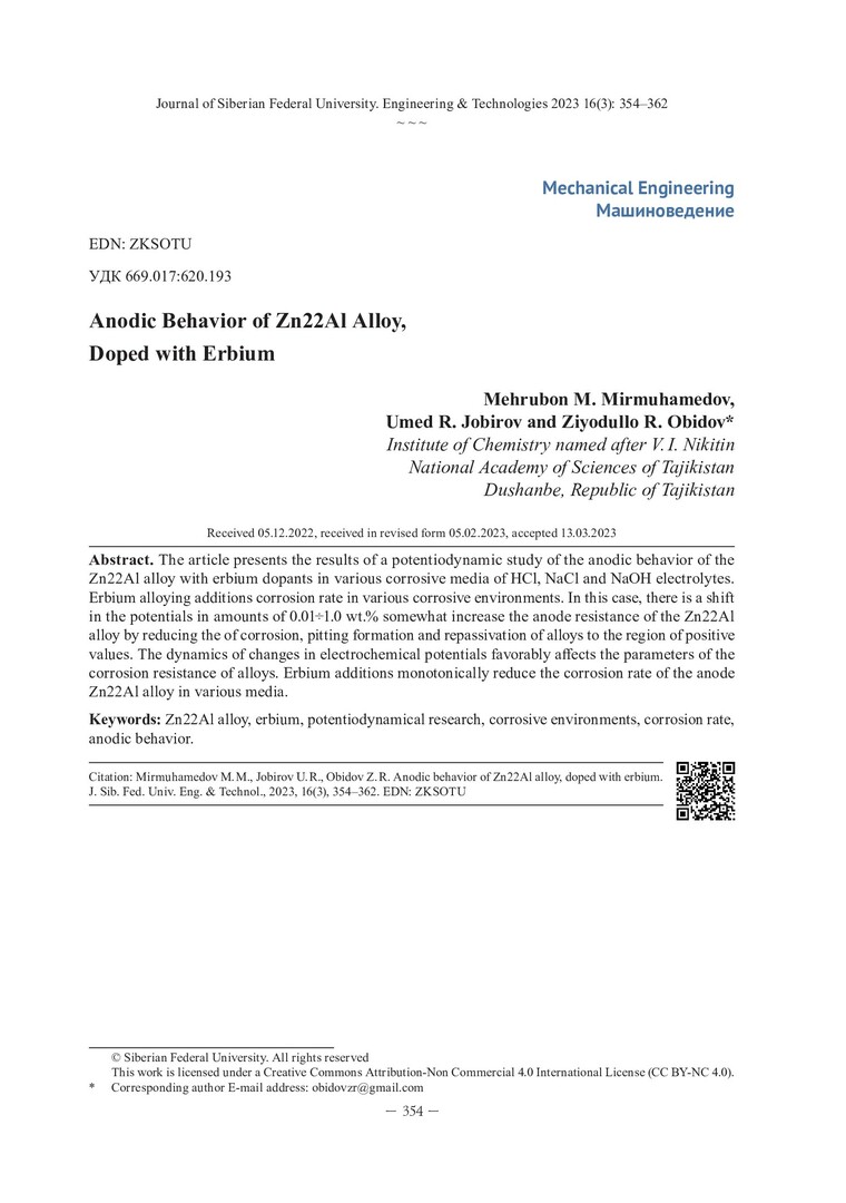 Библиографическое описание: Mirmuhamedov, M. M. Anodic Behavior of Zn22Al Alloy, Doped with Erbium = Анодное поведение сплава Zn22Al, легированного эрбием / M. M. Mirmuhamedov, U. R. Jobirov, Z. R. Obidov. - Текст : непосредственный // Журнал Сибирского федерального университета. Техника и технологии. - 2023. - Т. 16, № 3. - С. 354-362. - Библиогр.: с. 360-362. - ISSN 1999-494X.