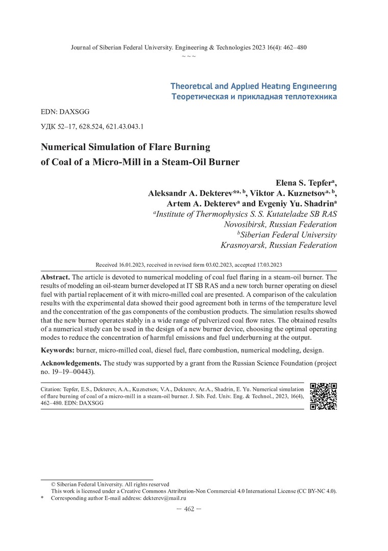 Библиографическое описание: Численное моделирование факельного горения угля микропомола в паромасляной горелке / Е. С. Тэпфер, А. А. Дектерев, В. А. Кузнецов [и др.]. - Текст : непосредственный // Журнал Сибирского федерального университета. Техника и технологии. - 2023. - Т. 16, № 4. - С. 462-480. - Библиогр.: с. 478-480. - ISSN 1999-494X.