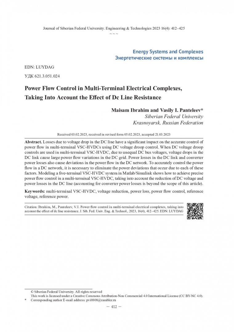 Библиографическое описание: Ибрагим, М. . Управление потоком мощности в многотерминальных электротехнических комплексах с учетом влияния сопротивления линии постоянного тока / М. Ибрагим, В. И. Пантелеев. - Текст : непосредственный // Журнал Сибирского федерального университета. Техника и технологии. - 2023. - Т. 16, № 4. - С. 412-425. - Библиогр.: с. 424-425. - ISSN 1999-494X.