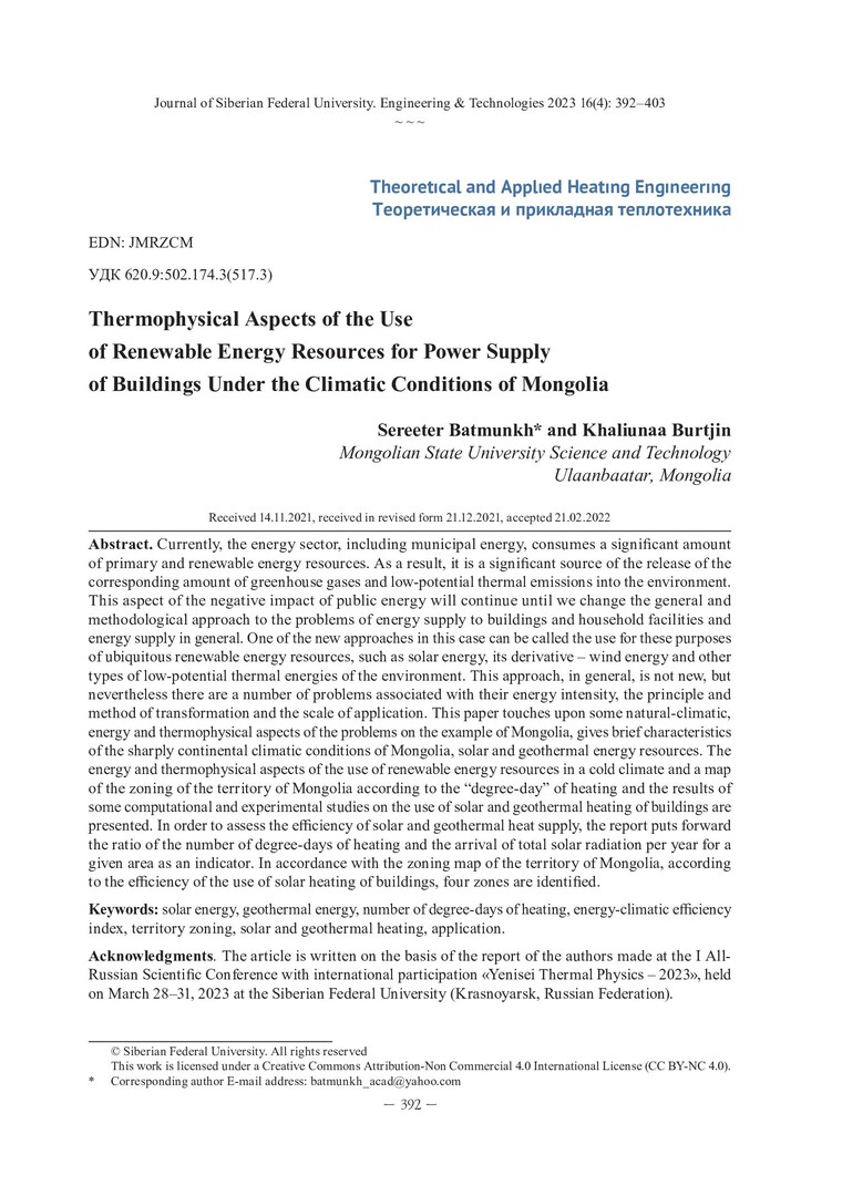 Библиографическое описание: Батмунх, С... Теплофизические аспекты использования возобновляемых энергетических ресурсов для энергоснабжения зданий в климатических условиях Монголии / С. Батмунх, Х. Буртжин. - Текст : непосредственный // Журнал Сибирского федерального университета. Техника и технологии. - 2023. - Т. 16, № 4. - С. 392-403. - Библиогр.: с. 403. - ISSN 1999-494X.