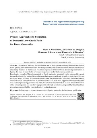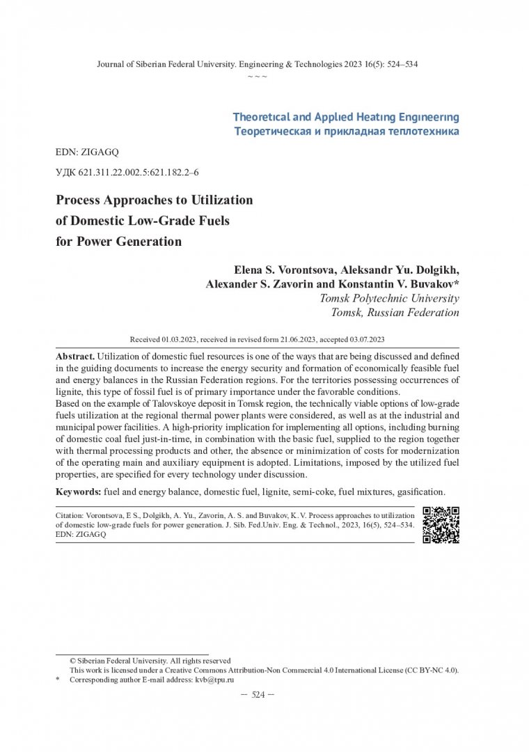 Библиографическое описание: Технологические подходы к энергетическому использованию местных низкосортных топлив / Е. С. Воронцова, А. Ю. Долгих, А. С. Заворин, К. В. Буваков. - Текст : непосредственный // Журнал Сибирского федерального университета. Техника и технологии. - 2023. - Т. 16, № 5. - С. 524-534. - Библиогр.: с. 532-534. - ISSN 1999-494X.