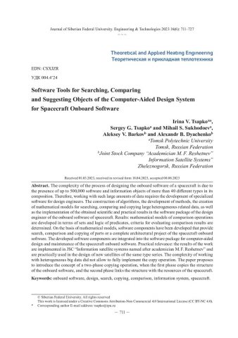 Библиографическое описание: Программные механизмы поиска, сравнения и копирования объектов системы автоматизированного проектирования бортового программного обеспечения космических аппаратов / И. В. Цапко, С. Г. Цапко, М. С. Суходоев [и др.]. - Текст : непосредственный // Журнал Сибирского федерального университета. Техника и технологии. - 2023. - Т. 16, № 6. - С. 711-727. - Библиогр.: с. 725-727. - ISSN 1999-494X.