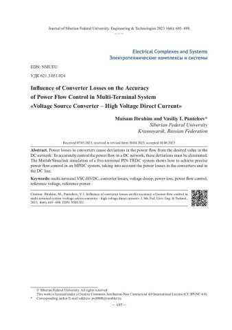 Библиографическое описание:Ибрагим, М... Влияние потерь преобразователя на точность управления потоками мощности в многотерминальных системах "преобразователь источника напряжения – высоковольтная передача постоянного тока" / М. Ибрагим, В. И. Пантелеев. - Текст : непосредственный // Журнал Сибирского федерального университета. Техника и технологии. - 2023. - Т. 16, № 6. - С. 685-698. - Библиогр.: с. 697-698. - ISSN 1999-494X.