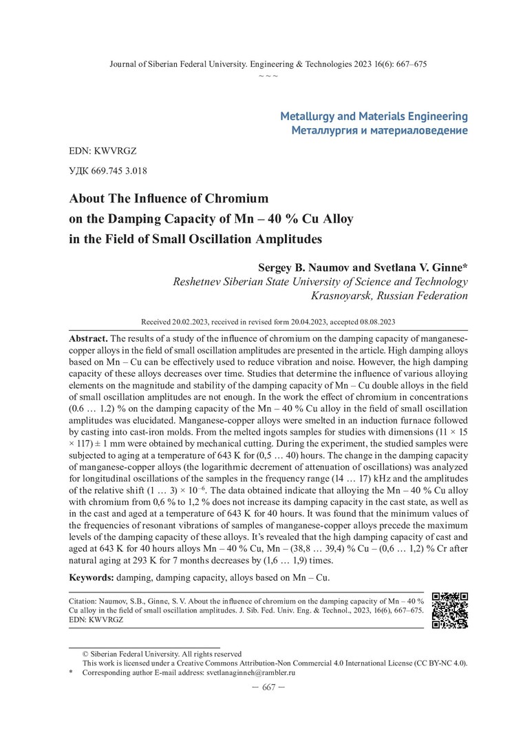 Библиографическое описание: Наумов, С. Б. О действии хрома на демпфирующую способность сплава Mn – 40 % Cu в области малых амплитуд колебаний / С. Б. Наумов, С. В. Гиннэ. - Текст : непосредственный // Журнал Сибирского федерального университета. Техника и технологии. - 2023. - Т. 16, № 6. - С. 667-675. - Библиогр.: с. 674-675. - ISSN 1999-494X.