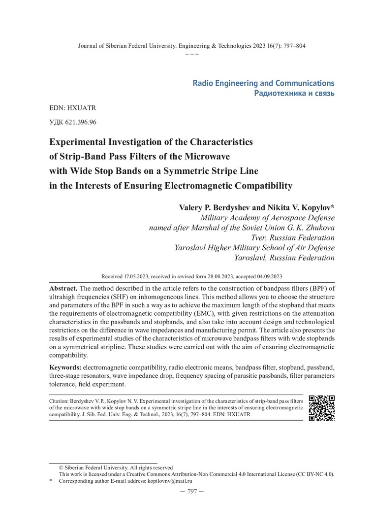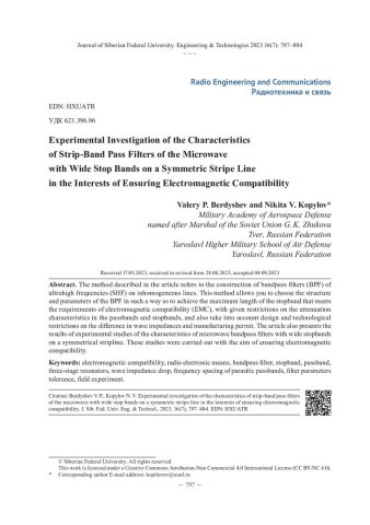 Библиографическое описание:Бердышев, В. П. Экспериментальное исследование характеристик шлейфовых полосно-пропускающих фильтров СВЧ с широкими полосами заграждения на симметричной полосковой линии в интересах обеспечения электромагнитной совместимости / В. П. Бердышев, Н. В. Копылов. - Текст : непосредственный // Журнал Сибирского федерального университета. Техника и технологии. - 2023. - Т. 16, № 7. - С. 797-804. - Библиогр.: с. 803-804. - ISSN 1999-494X.