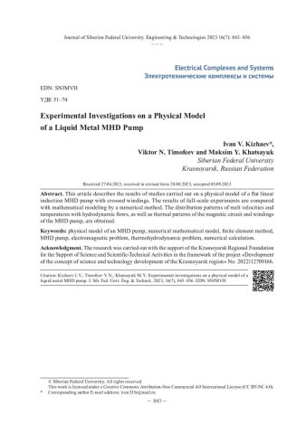 Аннотация:В данной статье описаны результаты исследований, проведенных на физической модели плоского линейного индукционного МГД‑насоса с перекрещивающимися обмотками. Проведено сравнение результатов натурных экспериментов с математическим моделированием численным методом. Получены картины распределения скоростей и температур расплава с гидродинамическими течениями, а также тепловые картины магнитопровода и обмоток МГД‑насоса.