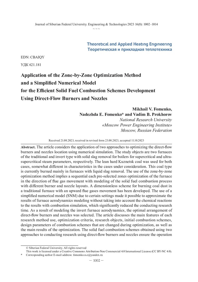Библиографическое описание: Fomenko, Mikhail V... Application of the Zone-by-Zone Optimization Method and a Simplified Numerical Model for the Efficient Solid Fuel Combustion Schemes Development Using Direct-Flow Burners and Nozzles = Применение позонного метода оптимизации и упрощенной численной модели для разработки эффективных схем сжигания твердого топлива с использованием прямоточных горелочных устройств и сопел / M. V. Fomenko, N. E. Fomenko, V. B. Prokhorov. - Текст : непосредственный // Журнал Сибирского федерального университета. Техника и технологии. - 2023. - Т. 16, № 8. - С. 1002-1014. - Библиогр.: с. 1013-1014. - ISSN 1999-494X.