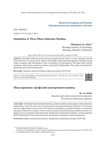 Библиографическое описание: Muhanned AL-Rawi. Simulation of Three Phase Induction Machine = Моделирование трехфазной асинхронной машины / Muhanned AL-Rawi. - Текст : непосредственный // Журнал Сибирского федерального университета. Техника и технологии. - 2023. - Т. 16, № 8. - С. 1015-1024. - Библиогр.: с. 1024. - ISSN 1999-494X.