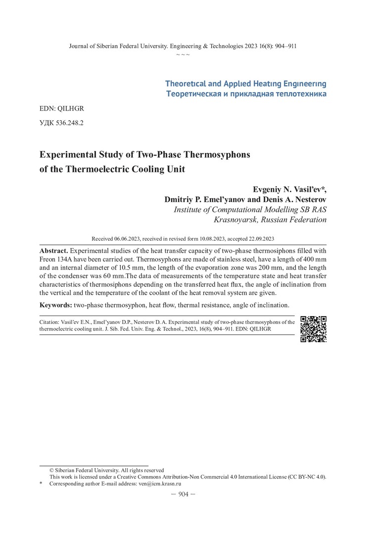 Библиографическое описание:Васильев, Е. Н. Экспериментальное исследование двухфазных термосифонов термоэлектрического блока охлаждения / Е. Н. Васильев, Д. П. Емельянов, Д. А. Нестеров. - Текст : непосредственный // Журнал Сибирского федерального университета. Техника и технологии. - 2023. - Т. 16, № 8. - С. 904-911. - Библиогр.: с. 911. - ISSN 1999-494X.