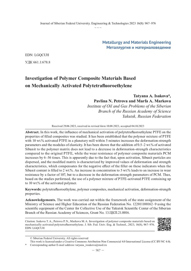Библиографическое описание: Исакова, Т. А. Исследование полимерных композиционных материалов на основе механоактивированного политетрафторэтилена / Т. А. Исакова, П. Н. Петрова, М. А. Маркова. - Текст : непосредственный // Журнал Сибирского федерального университета. Техника и технологии. - 2023. - Т. 16, № 8. - С. 967-976. - Библиогр.: с. 975-976. - ISSN 1999-494X.