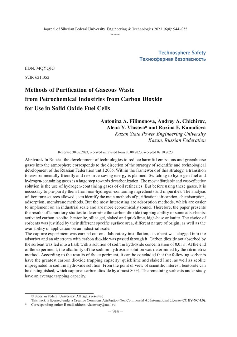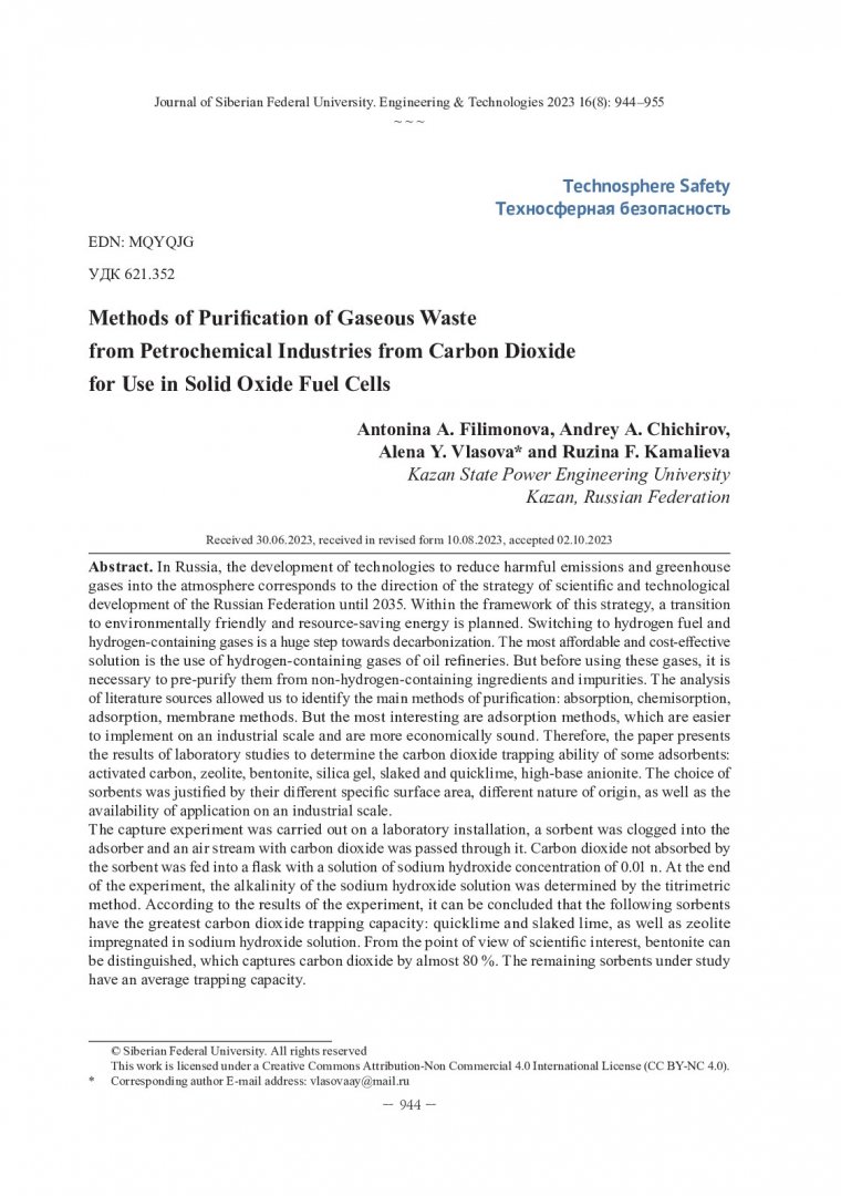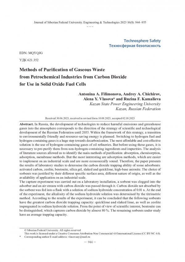 Библиографическое описание:Способы очистки газообразных отходов нефтехимических производств от углекислого газа для использования в твердооксидных топливных элементах / А. А. Филимонова, А. А. Чичиров, А. Ю. Власова, Р. Ф. Камалиева. - Текст : непосредственный // Журнал Сибирского федерального университета. Техника и технологии. - 2023. - Т. 16, № 8. - С. 944-955. - Библиогр.: с. 954-955. - ISSN 1999-494X.