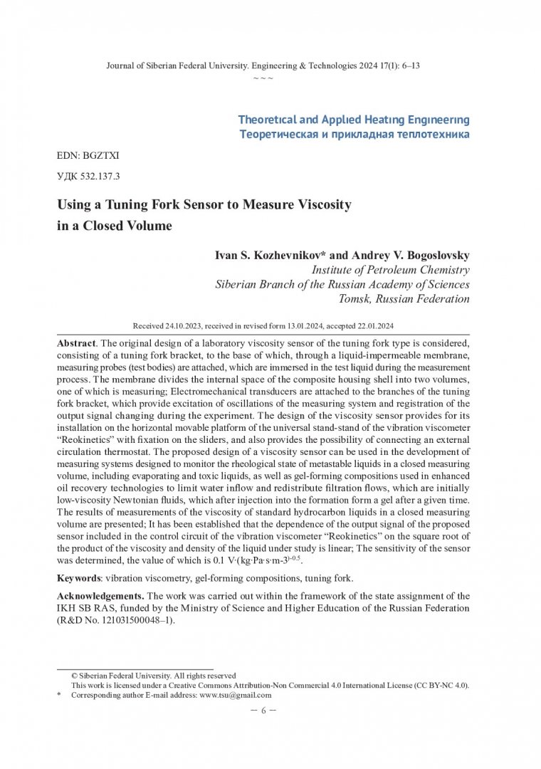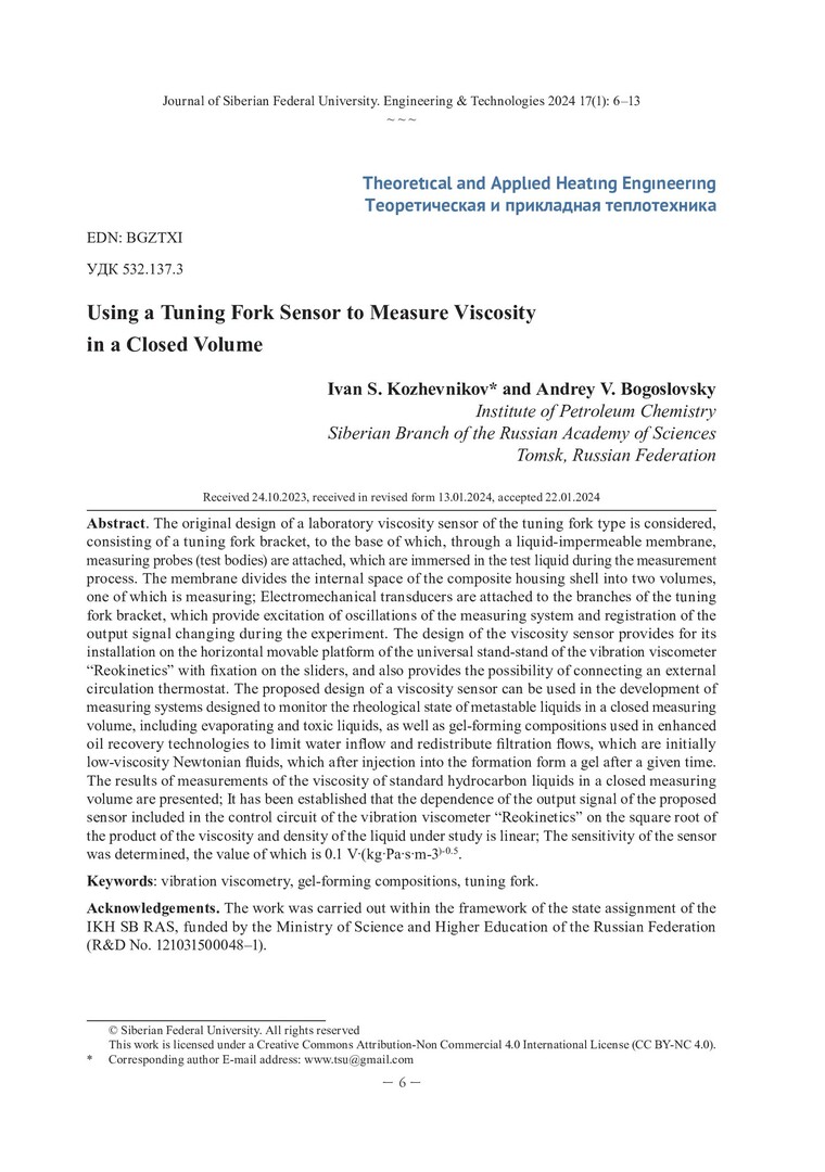Библиографическое описание: Кожевников, И. С. Использование камертонного датчика для измерения вязкости в закрытом объеме / И. С. Кожевников, А. В. Богословский. - Текст : непосредственный // Журнал Сибирского федерального университета. Техника и технологии. - 2024. - Т. 17, № 1. - С. 6-13. - Библиогр.: с. 12-13. - ISSN 1999-494X.