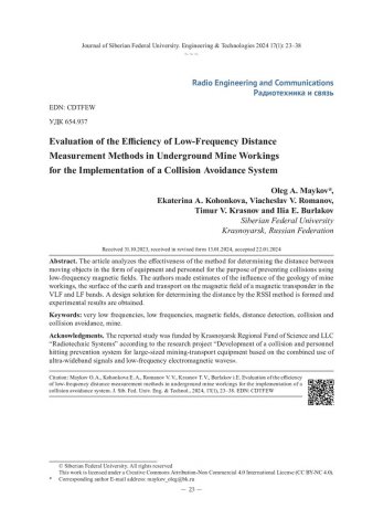 Аннотация:В статье приведен анализ эффективности метода определения расстояния между подвижными объектами в виде техники и персонала для целей предотвращения столкновений с использованием низкочастотных магнитных полей. Авторами сделаны оценки влияния геологии горных выработок, поверхности земли и транспорта на магнитное поле магнитного транспондера в VLF и LF диапазоне. Сформировано конструкторское решение для определения расстояния методом RSSI и получены экспериментальные результаты.