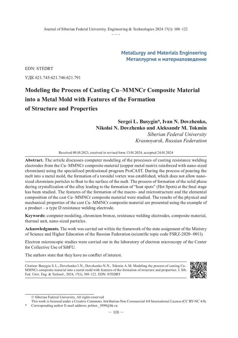 Библиографическое описание:Моделирование процесса литья композиционного материала Cu–MMNCr в металлическую форму с особенностями формирования структуры и свойств / С. Л. Бусыгин, И. Н. Довженко, Н. Н. Довженко, А. М. Токмин. - Текст : непосредственный // Журнал Сибирского федерального университета. Техника и технологии. - 2024. - Т. 17, № 1. - С. 108-122. - Библиогр.: с. 122. - ISSN 1999-494X.