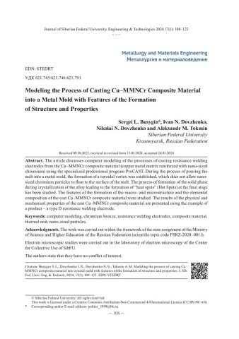 Аннотация:В статье рассмотрено компьютерное моделирование процессов литья электродов контактной сварки из композиционного материала Cu–MMNCr (медный металломатричный с армированием наноразмерным хромом) с использованием специализированной профессиональной программы ProCAST. Установлено в процессе заливки расплава в металлическую форму образование тороидального вихря, не позволяющего наноразмерным частицам хрома всплывать на зеркало расплава. Изучен процесс формирования твёрдой фазы при кристаллизации сплава, приводящий к образованию «теплового узла» (Hot Spots) на завершающей стадии. Исследованы особенности формирования макро– и микроструктуры и элементный состав литого композиционного материала Cu–MMNCr. Представлены результаты физико- механических свой- ств литого композиционного материала Cu–MMNCr на примере изделия – электрода контактной сварки типа D.
