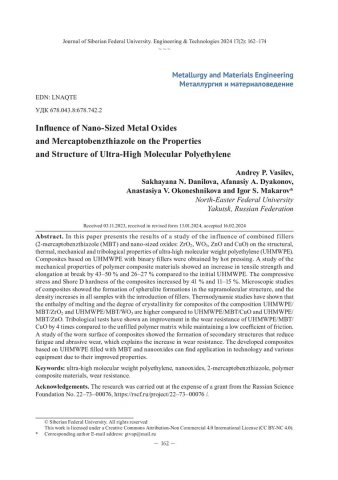 Библиографическое описание: Влияние наноразмерных оксидов металлов и 2-меркаптобензтиазола на свойства и структуру сверхвысокомолекулярного полиэтилена / А. П. Васильев, С. Н. Данилова, А. А. Дьяконов [и др.]. - Текст : непосредственный // Журнал Сибирского федерального университета. Техника и технологии. - 2024. - Т. 17, № 2. - С. 162-174. - Библиогр.: с. 172-174. - ISSN 1999-494X.