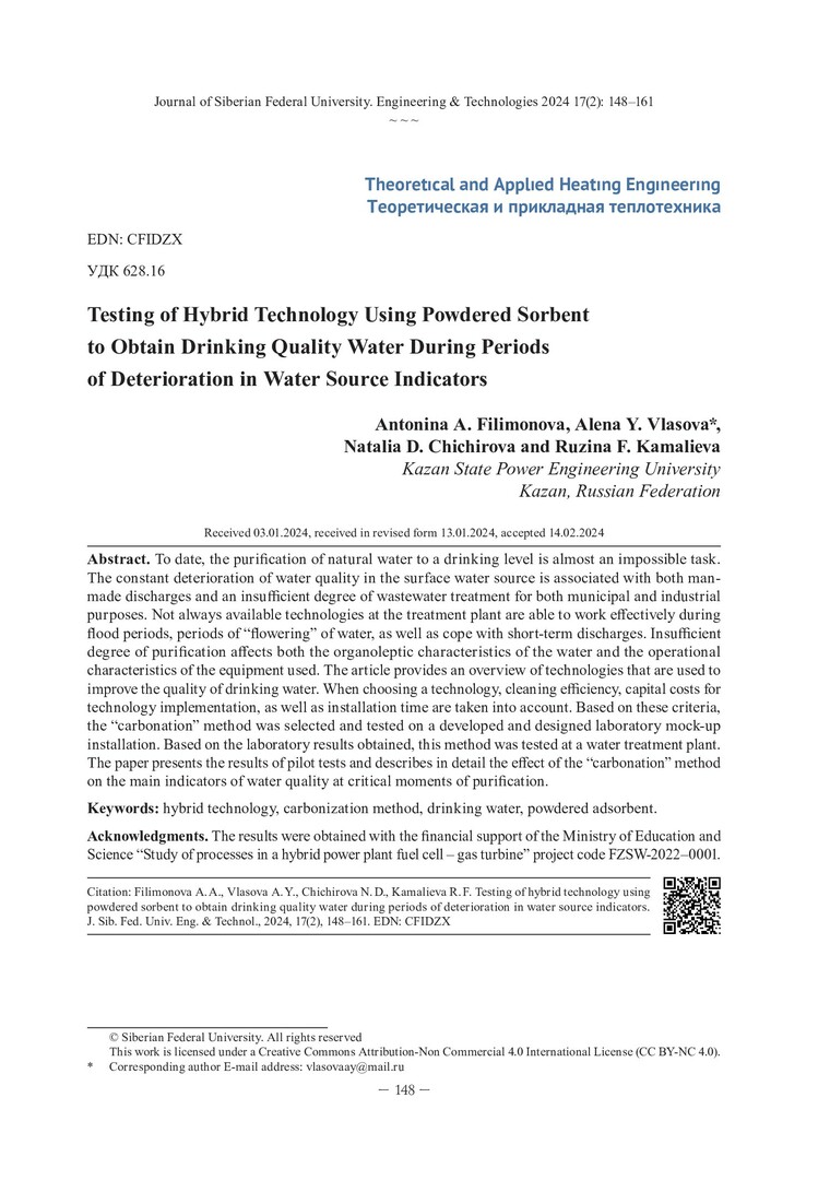 Библиографическое описание: Апробирование гибридной технологии с использованием порошкообразного сорбента для получения воды питьевого качества в периоды ухудшения показателей водоисточника / А. А. Филимонова, А. Ю. Власова, Н. Д. Чичирова, Р. Ф. Камалиева. - Текст : непосредственный // Журнал Сибирского федерального университета. Техника и технологии. - 2024. - Т. 17, № 2. - С. 148-161. - Библиогр.: с. 160-161. - ISSN 1999-494X.