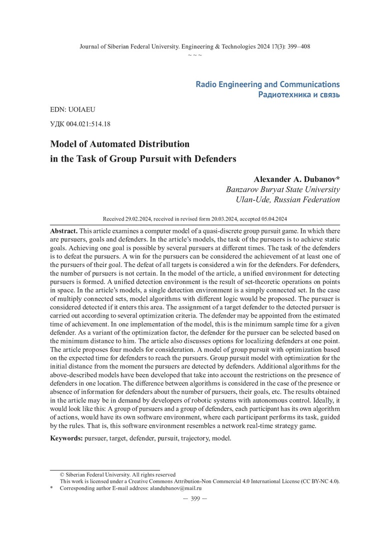 Библиографическое описание: Дубанов, А. А. Модель автоматизированного распределения в задаче группового преследования с защитниками = Model of Automated Distribution in the Task of Group Pursuit with Defenders / А. А. Дубанов. - Текст : непосредственный // Журнал Сибирского федерального университета. Техника и технологии. - 2024. - Т. 17, № 3. - С. 399-408. - ISSN 1999-494X.