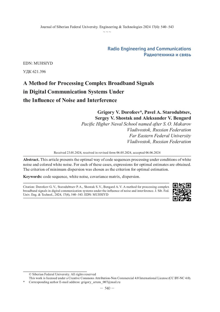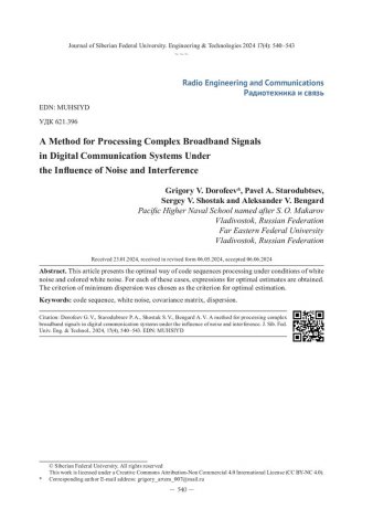 Библиографическое описание:Способ обработки сложных широкополосных сигналов в цифровых системах связи в условиях воздействия шумов и помех / Г. В. Дорофеев, П. А. Стародубцев, С. В. Шостак, А. В. Бенгард. - Текст : непосредственный // Журнал Сибирского федерального университета. Техника и технологии. - 2024. - Т. 17, № 4. - С. 540-543. - Библиогр. в конце ст. - ISSN 1999-494X.