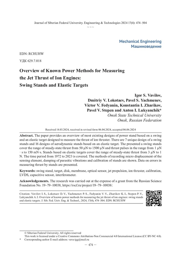 Библиографическое описание: Обзор известных силовых способов измерения реактивной тяги ионных двигателей: качельные стенды и упругие мишени / И. С. Вавилов, Д. В. Локотаев, П. С. Ячменев [и др.]. - Текст : непосредственный // Журнал Сибирского федерального университета. Техника и технологии. - 2024. - Т. 17, № 4. - С. 474-504. - Библиогр. в конце ст. - ISSN 1999-494X.