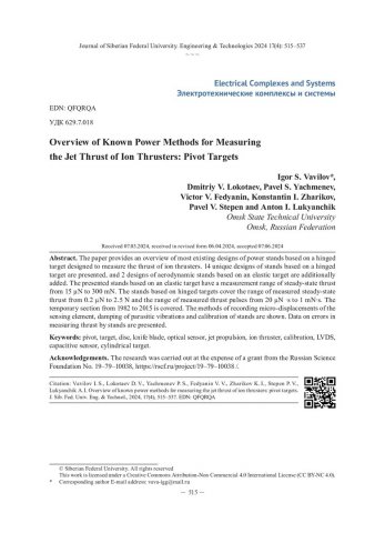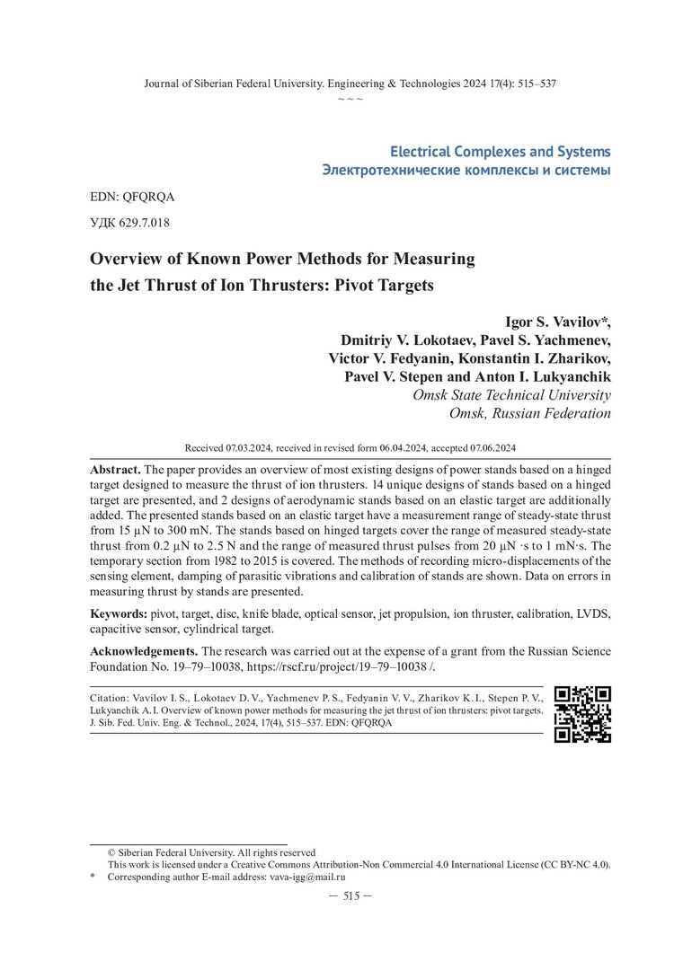 Библиографическое описание: Обзор известных силовых способов измерения реактивной тяги ионных двигателей: шарнирные мишени / И. С. Вавилов, Д. В. Локотаев, П. С. Ячменев [и др.]. - Текст : непосредственный // Журнал Сибирского федерального университета. Техника и технологии. - 2024. - Т. 17, № 4. - С. 515-537. - Библиогр. в конце ст. - ISSN 1999-494X.