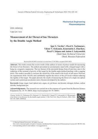 Библиографическое описание: Измерение реактивной тяги ионных двигателей методом двойного угла / И. С. Вавилов, П. С. Ячменев, В. В. Федянин [и др.]. - Текст : непосредственный // Журнал Сибирского федерального университета. Техника и технологии. - 2024. - Т. 17, № 5. - С. 628-641. - Библиогр. в конце ст. - ISSN 1999-494X.