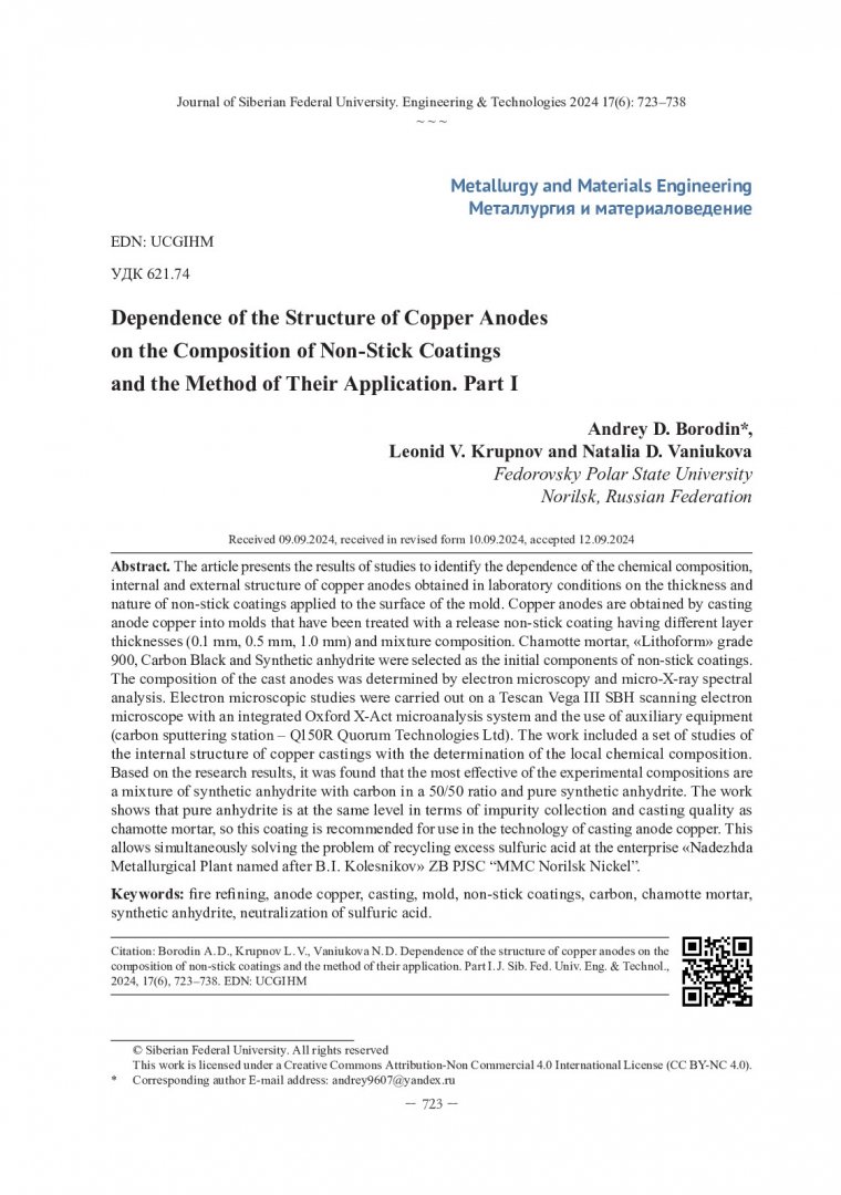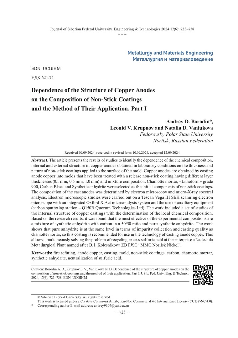 Библиографическое описание: Бородин, А. Д. Зависимость структуры медных анодов от состава противопригарных покрытий и способа их нанесения. Часть I / А. Д. Бородин, Л. В. Крупнов, Н. Д. Ванюкова. - Текст : непосредственный // Журнал Сибирского федерального университета. Техника и технологии. - 2024. - Т. 17, № 6. - С. 723-738. - Библиогр. в конце ст. - ISSN 1999-494X.