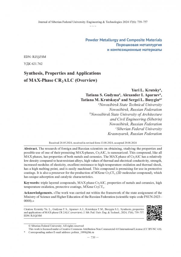 Библиографическое описание: Синтез, свойства и области применения МАХ‑фазы CR2ALC (обзор) / Ю. Л. Крутский, Т. С. Гудыма, А. И. Апарнев [и др.]. - Текст : непосредственный // Журнал Сибирского федерального университета. Техника и технологии. - 2024. - Т. 17, № 6. - С. 739-757. - Библиогр. в конце ст. - ISSN 1999-494X.